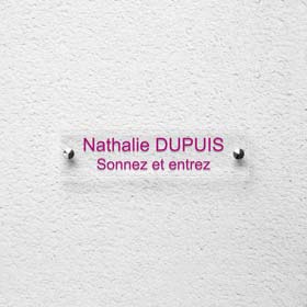 • La plaque en plexiglas transparent accueille votre texte grâce à un marquage adhésif haute qualité sur l’envers de la plaque. Disponible en 11 couleurs différentes, le marquage de votre texte est garanti longue durée de part la qualité du film utilisé d'une part, et la pose de ce film au dos de la plaque d'autre part, qui sera ainsi protégé une fois la plaque posée contre son support. Un marquage par gravure est également possible, sur demande de devis uniquement